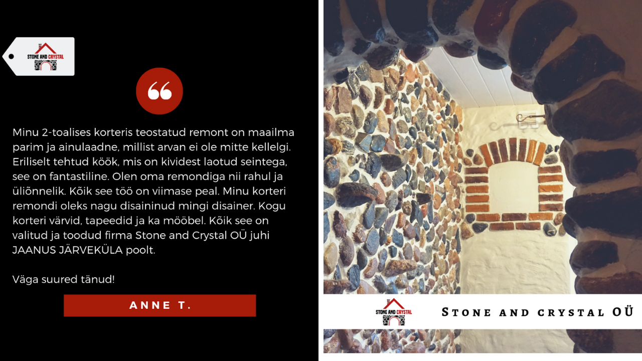 Minu 2-toalises korteris teostatud remont on maailma parim ja ainulaadne, millist arvan ei ole mitte kellelgi. Eriliselt tehtud köök, mis on kividest laotud seintega, see on fantastiline. Olen oma remondiga nii rahul ja üliõnnelik. Kõik see töö on viimase peal.Minu korteri remondi oleks nagu disaininud mingi disainer. Kogu korteri värvid, tapeedid ja ka mööbel. Kõik see on valitud ja toodud firma Stone and Crystal OÜ juhi JAANUS JÄRVEKÜLA poolt. Väga suured tänud!