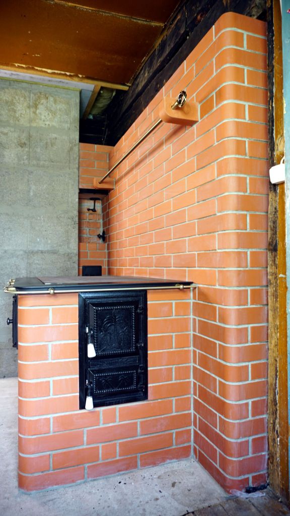 PLIIT. Ääreraud nr 4. Nii sai tagatud koldele piisav suurus ja puuhalgudele sobiv pikkus. Ust soovis Klient sellist lihtsamat aga suurt, et ikka korralikumad halud alla mahuks. Praehi SVT malmuksega. Pliidi all varbaeend, mis on äärmiselt vajalik, sest tagab ergonoomilisuse ja mugavuse pliidi juures toimetamisel. Varbaeendi juures olevad pliidi “jalad” lahendasime Lode F14 nurgakiviga, millel mõlemad nurgad kumerad. Nii on tagatud ilus ja korrektne väljanägemine, kus ei ole vuugid üheljoonel üksteise kohal.