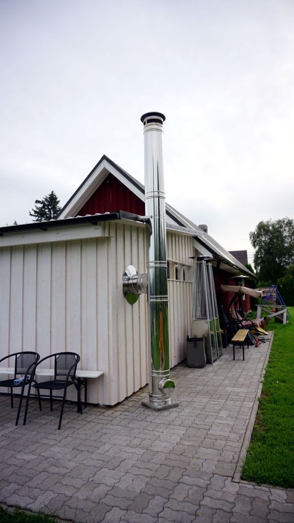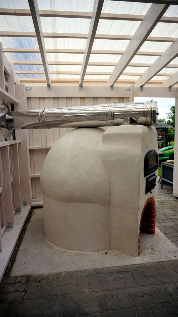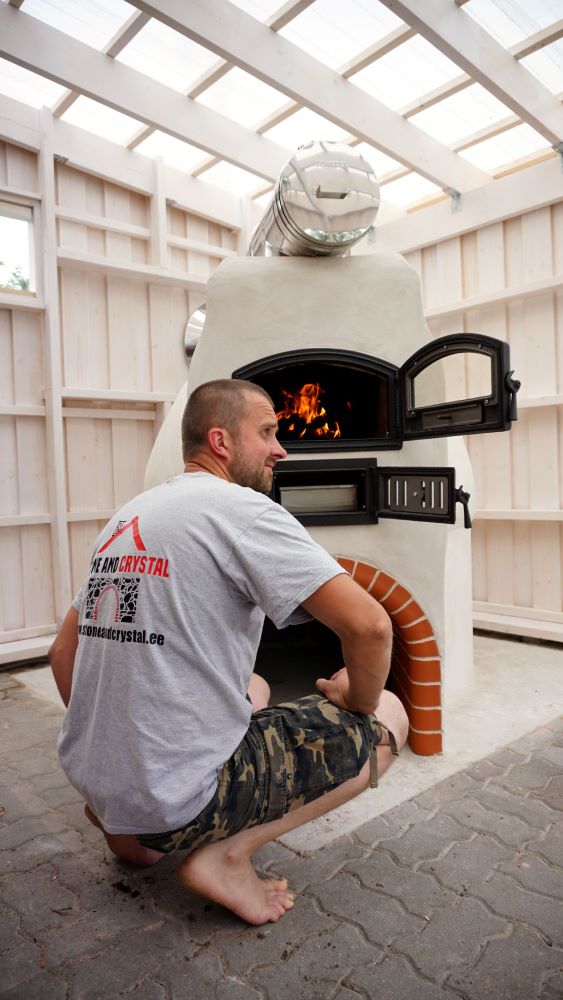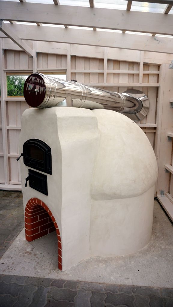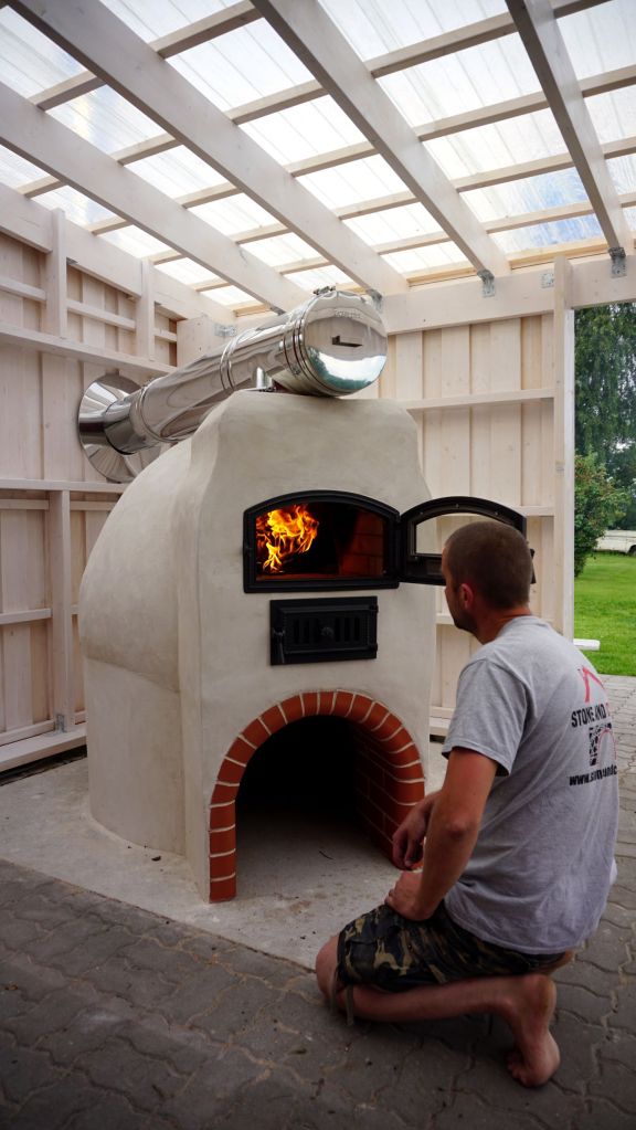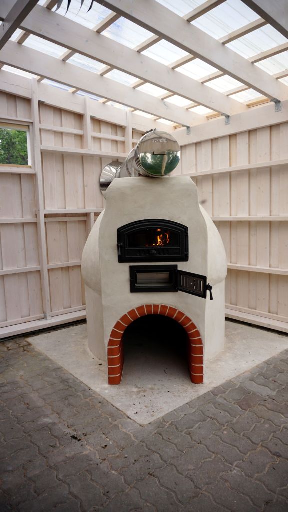 Valge viimistlusega pizzaaahi. Viimistluseks on kasutatud lubikrohvi, ja viimane kiht on kaetud lubi peenviimistlus krohvikihiga. Kasutasime Meistri kaubamärgi krohvitooteid. Puudehoiukoht lahendatud võlviga, ja võlv on teostatud Lode Janka punaste tellistega, tagamaks punase ja valge kontrasti parema esiletoomise. Pizzaaahju põhja lahendasime kolme kihilisena, et anda võimalikult head salvestusomadused. Esimene kiht šhamott, teine kiht punane tellis ja kolmas kiht isolaator kaltsiumsilikaat plaat. Kupliosa on soojustatud kiudmatiga kahes kihis ja armeeritud silcatex võrguga. Korstnaks valisime metallkorstna. Enamus korstnast asub õues otsese ilmastiku käes, ja metallkorsten oli antud olukorras parima valik. Pinna ilmastiku kindlus ja tuleohutus. Korstnamüts on varustatud ka sädemepüüdjaga, mis antud olukorra lahendusel on vältimatu. Elav tuli loob jahedatesse suveõhtutesse õdusa tunde, mis meie esivanemate kodus oli igapäevane rituaal.
