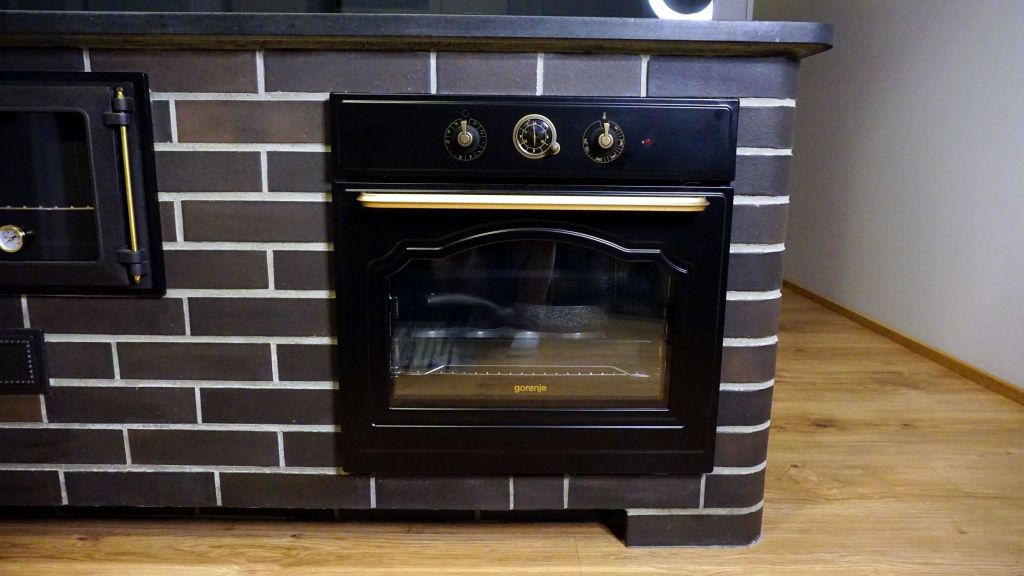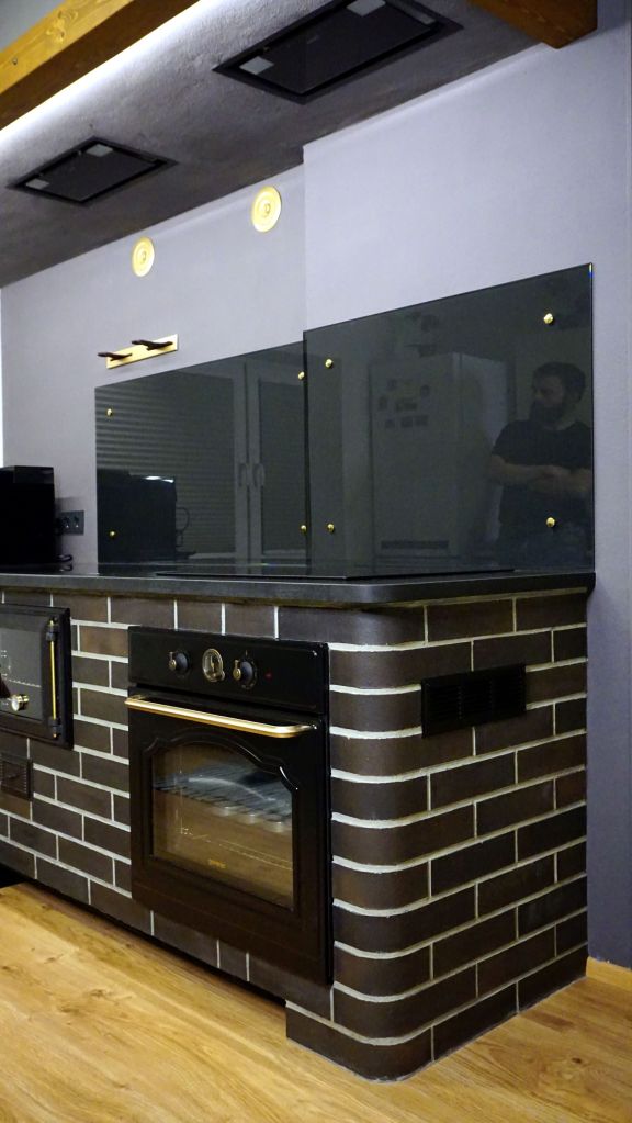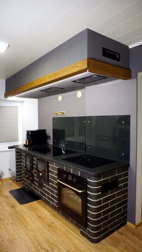 Pliit algab puudehoiu kohaga, pliidi kolle, praeahi, elektripliit ja elektriahi. Pliidi taguse seina ja kubu krohvisime savikrohviga ja värvisime tumedama tooni saamiseks selle musta savivärviga. Pliidi tööpinnale paigaldasime karastatud klaasi, mille toon tumehall, kruvide ilukapslid toonis kuldne. Kõik värvid valis Klient, ja tulemus on Teie ees.