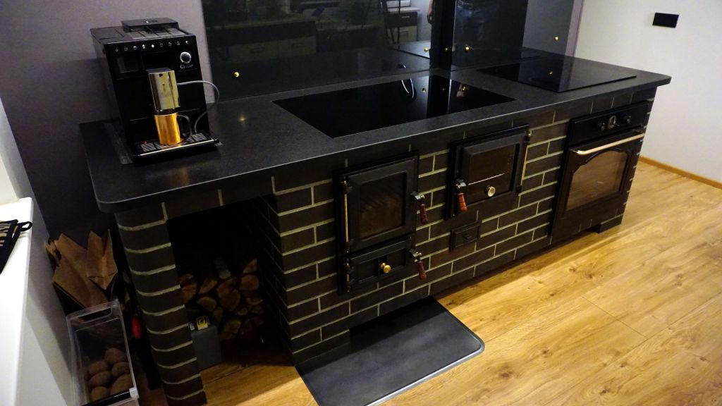 Suur ja funktsionaalne pliit. Pliidi pikkus 258 cm ja kõrgus 86 cm. Antud pliit on laotud Wienerbergeri Antratsiit tellistest, ja tarvikute juures jälgisime kuldset tooni, – nii oli Kliendi valik ja kindel soov. Pliidi plaadiks paigaldasime vastava kuumakindla klaasi. Ääreraua asemel soovis Klient graniitplaati, mis on kindlat ühes tükis ja ilma ühegi liite vuugita. Nuputamist oli, aga siiani püsib graniitplaat kindlalt ühes tükis. Koondasime kõik vajaliku ühte kivikehandisse.