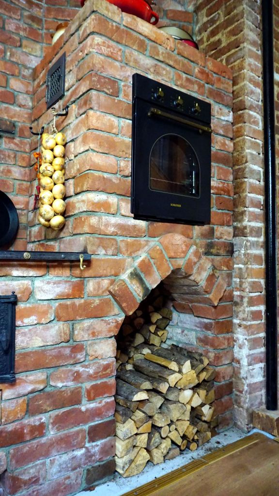 Elektriahi on viidud sellisele kõrgusele, kus pererahval oleks mugav toimetada. Nupud asetsevad silmade kõrgusel. Elektriahju all on puude hoiukoht. Mugav ja kõrge, et sinna mahuks piisav kogus küttematerjali. Võlvi lukukivis on aga peremärk. Vana ja individuaalne märk, mis käib kaasas just nende inimestega ja nende kohaga.