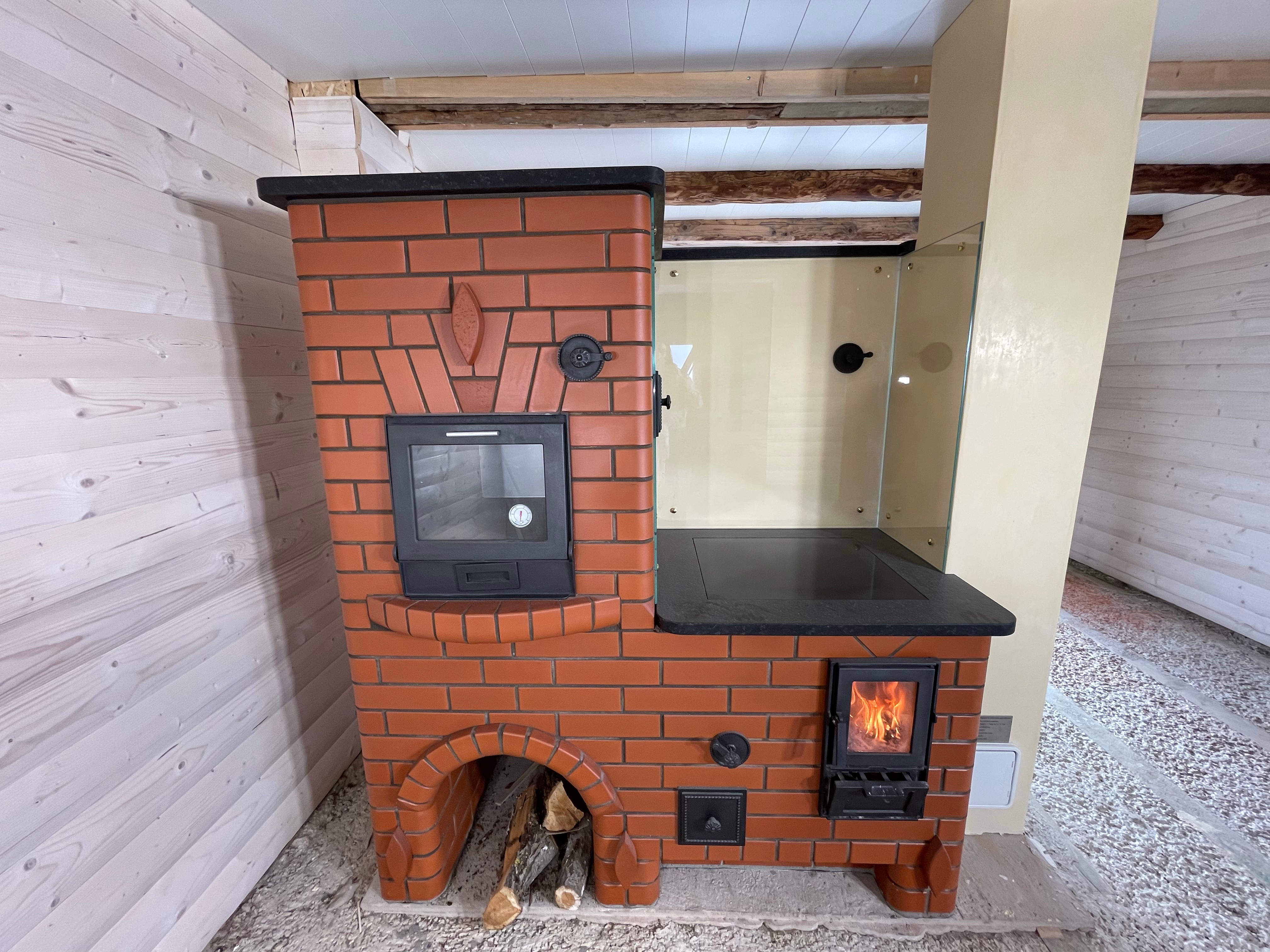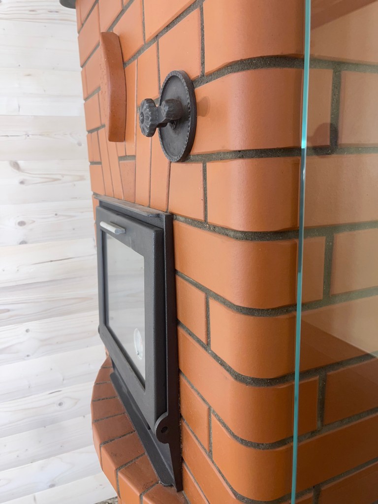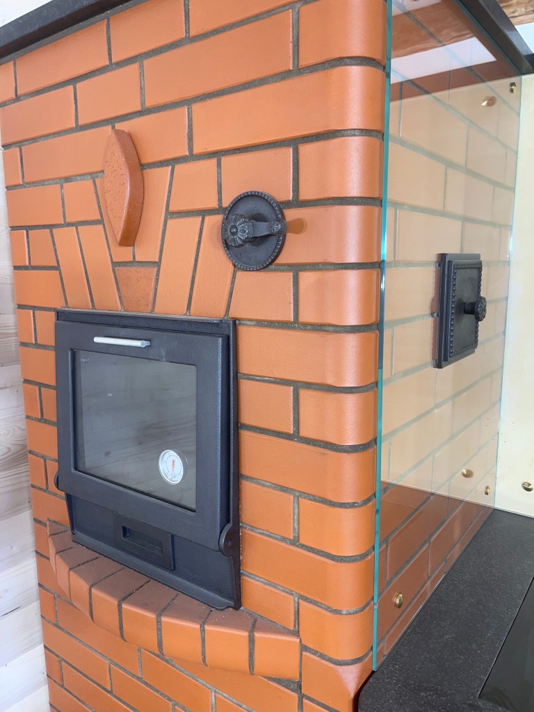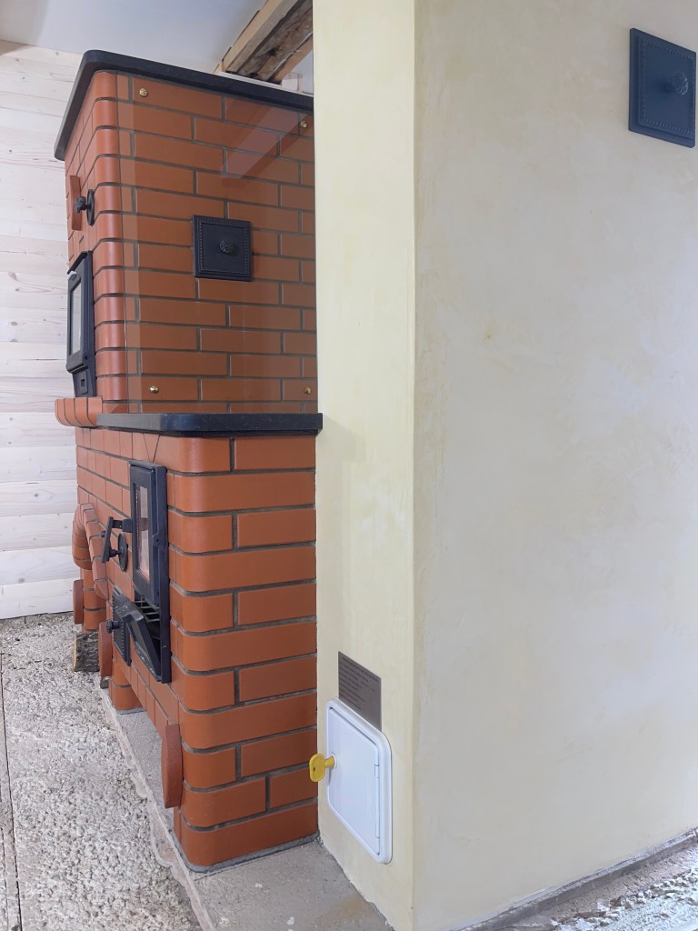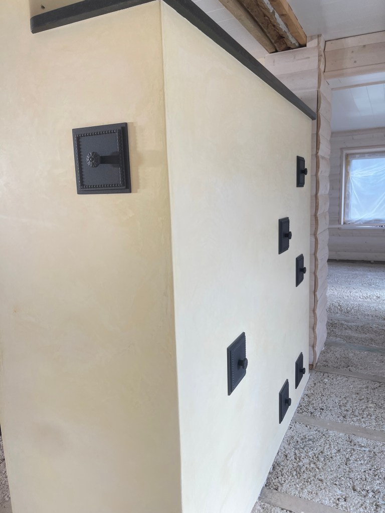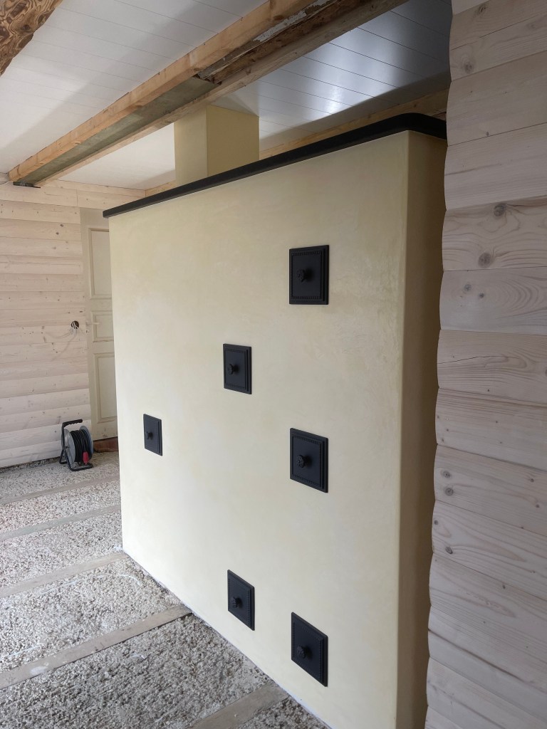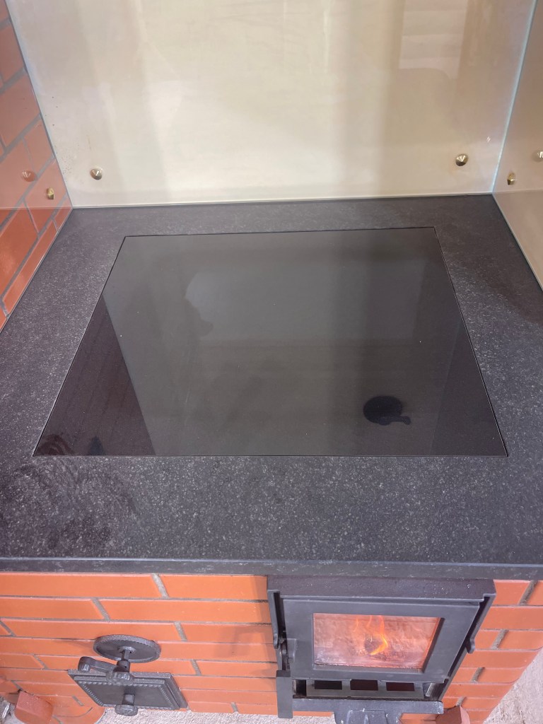 Mõõtudelt väike ja kompaktne. Kogu küttekompleksi pikkus koos koos korstnaga 180cm. Pliidi kõrgus 85 cm ja pliit loomulikult varbaeendiga mis tagab mugava toimetamise pliidi juures. Praeahju kapi täiskõrgus 180cm. Kompleksi sügavus koos soemüüriga 96cm. Soemüüri ja korstna osa krohvisime lubi stuccoga mis annab mõnusa siidise ja sileda pinna. Kasutasime tooni TR/0324 10% ja saime sellise kergelt kollase tooni. Kliendile tegime enne krohvimist ka tooni näidised ja sellise valiku kasuks otsustati. Pliidi ääreraua asemel kasutasime graniit plaati mille pind on kergelt krobeline ehk harjatud variant. Graniidi toon Nero Assoluto ja paksus 30mm. Pliidi plaadina kasutasime klaasi. Pliidi tööpinna kaitseks paigaldasime karastatud klaasid toonis eriti kirgas. Klaaside paksus 6mm ja kruvide toon kuldne.