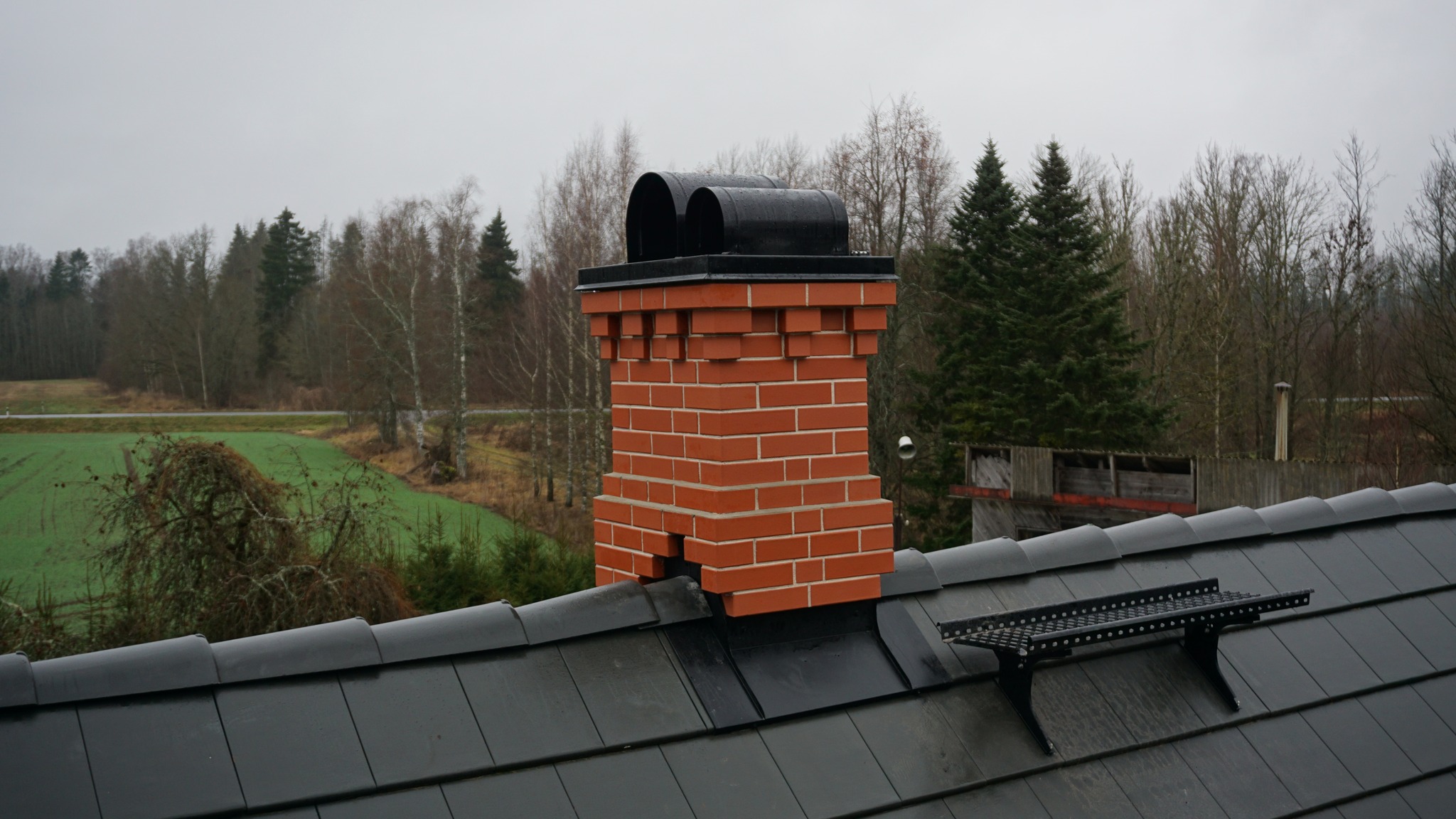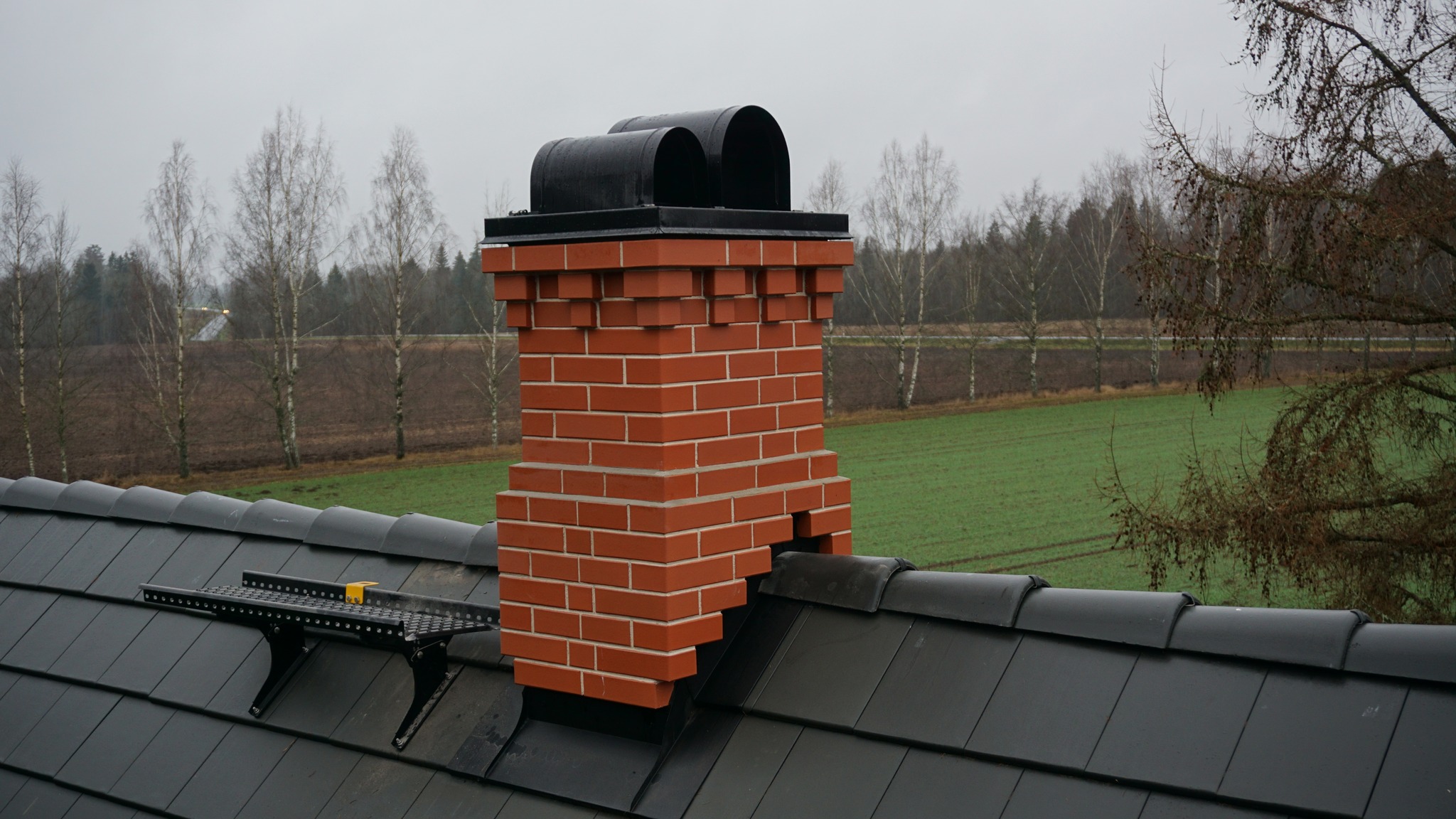 Paigaldasime Schiedeli Rondo Plus moodulkorstnad keraamilise sisuga, kahe lõõriga – suitsu- ja ventilatsioonilõõr. Moodulkorstende välisosa kujundasime ümber tellisvoodriga mantelplokkidele, vormides need arhitektuuriga sobituvateks korstnapitsideks.