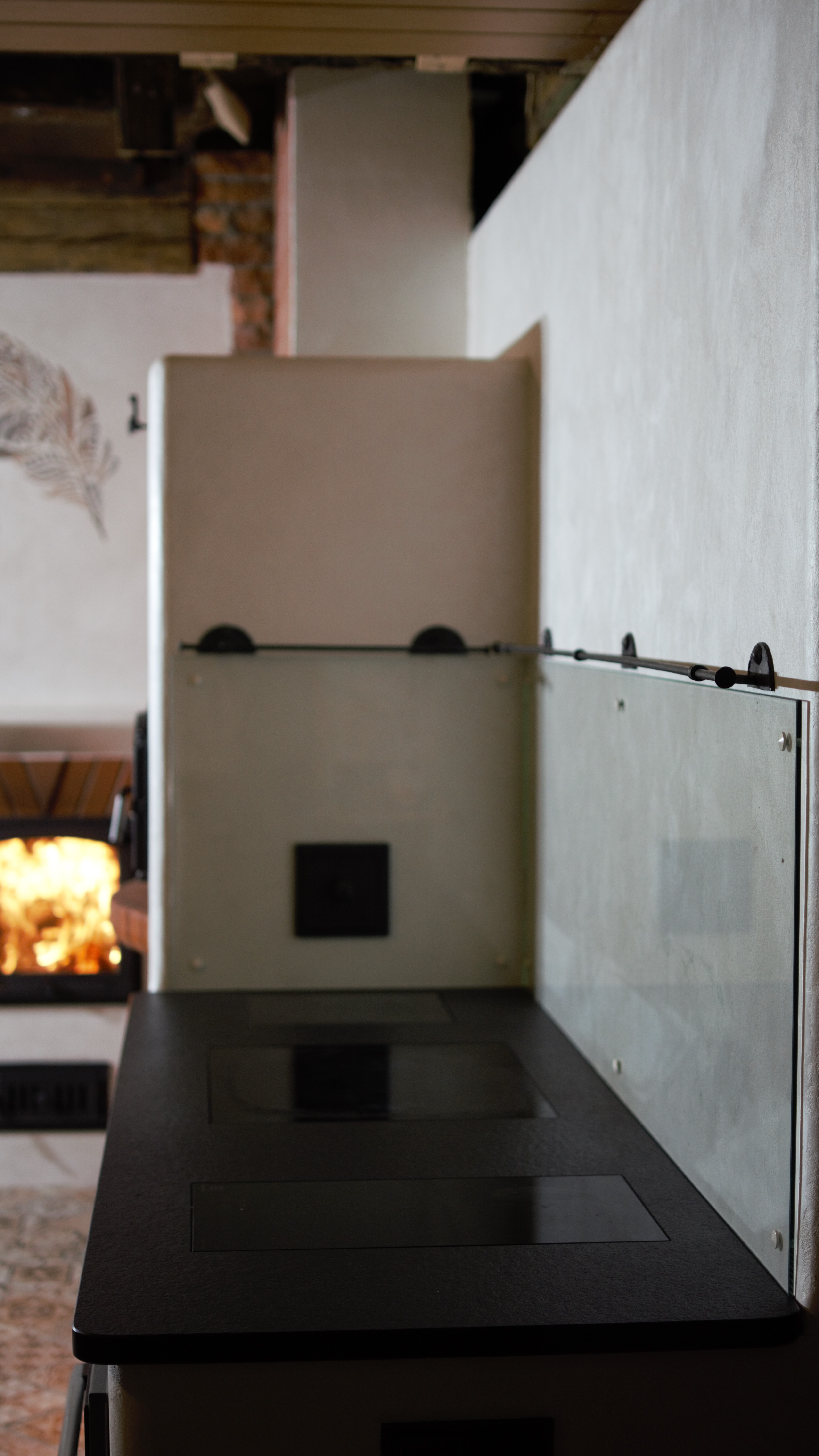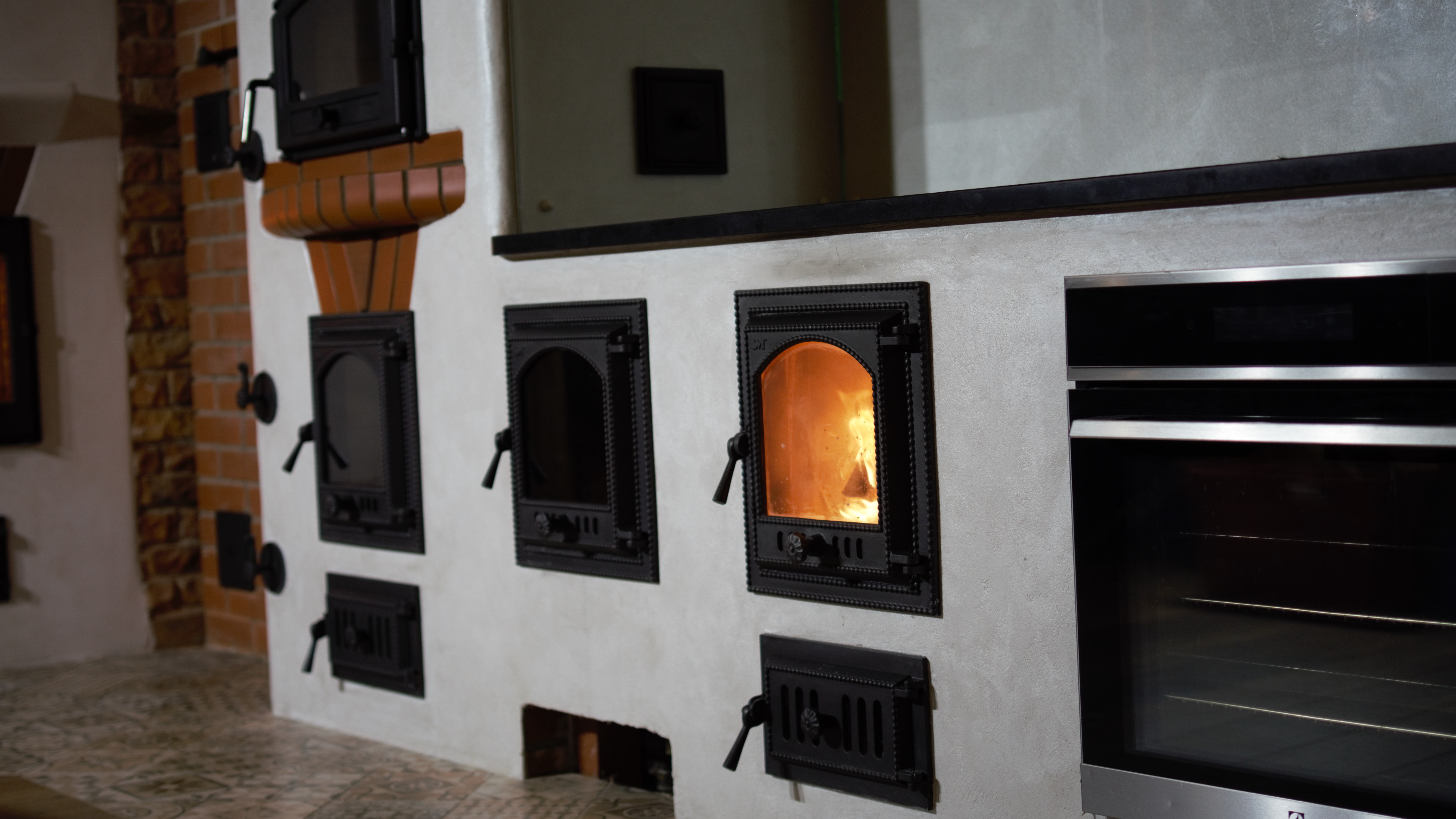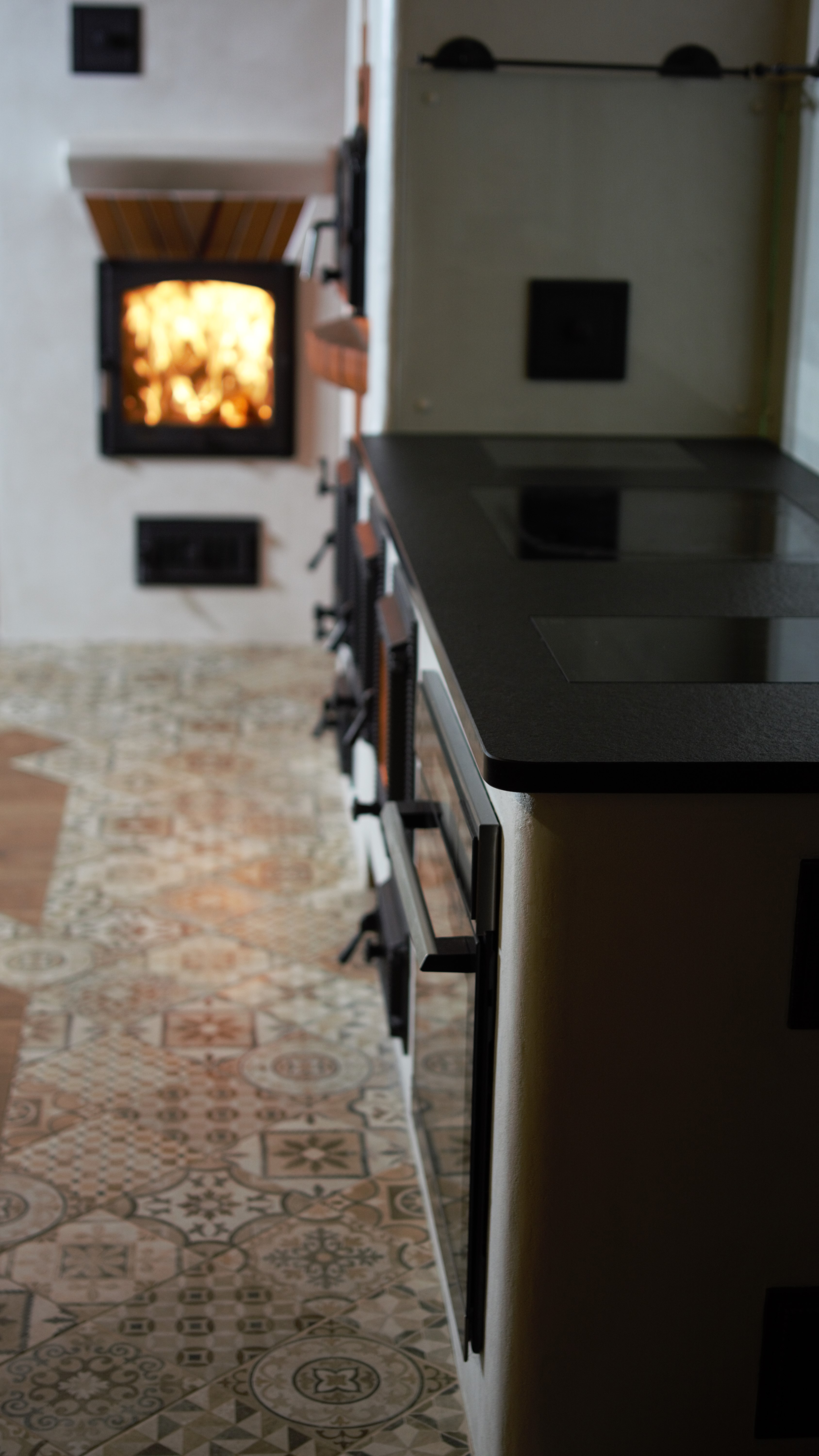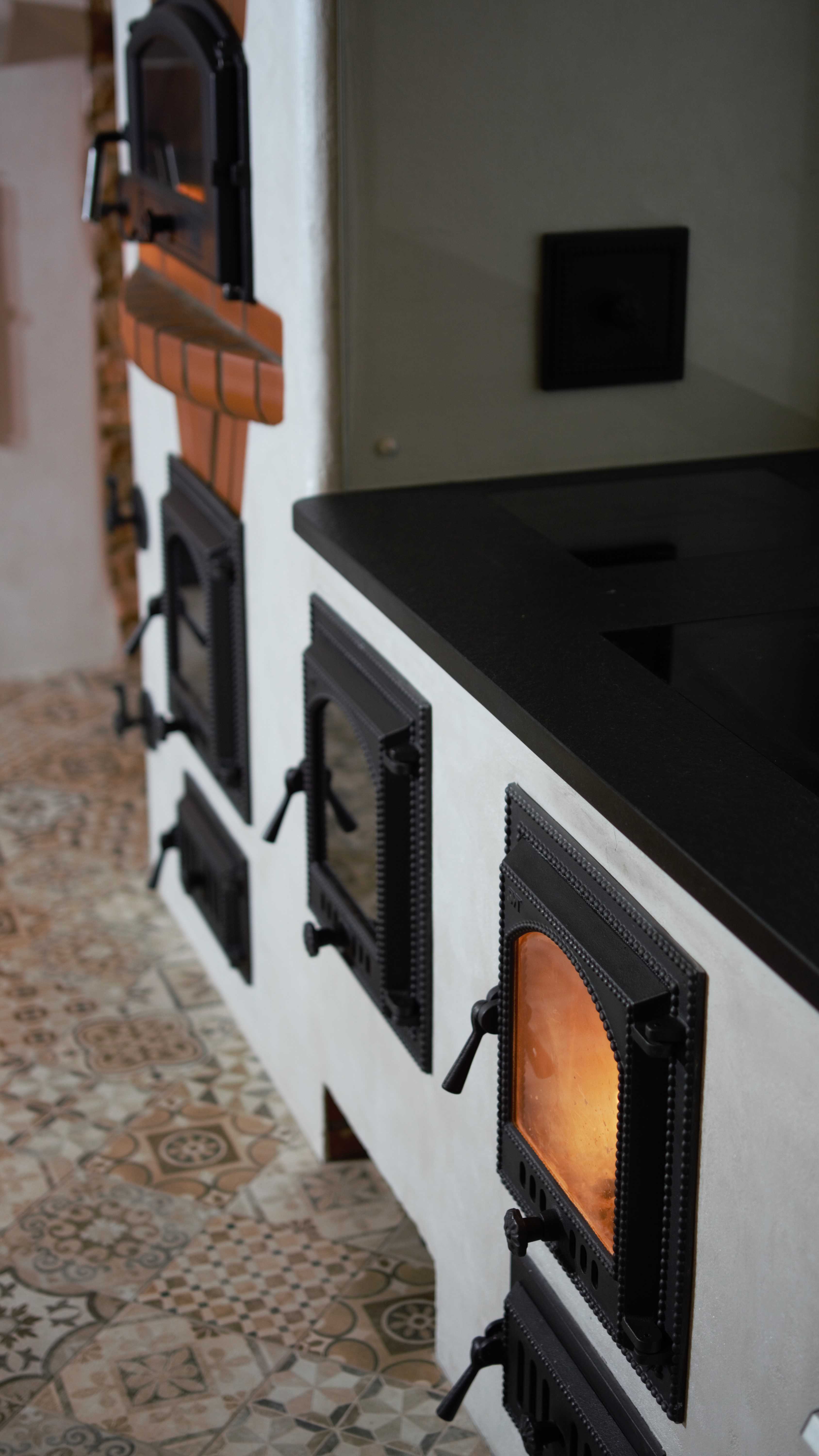 Tilsi-Tamme küttekompleks Pihlapuude väravalt viib looklev tee ilmapuu alla. Siin ilmapuu kaitsva võra varju alla on loonud veelinnurahvas oma koja ja just sellesse kotta viiski seekord meid meie tee. Aeg läheb uskumatult kiiresti ja nagu vahest ikka juhtub saame pildistama minna ikka tükk aega hiljem kui siseviimistlus on jõudnud järele. Nii ka seekord. Juba kolm aastat tagasi teostasime sellise küttekompleksi. Antud küttekompleks on lahendatud nii, et kogu kütmine toimub köögist ja kogu maja on soe. Tellija soov oli, et kui ta istub köögilaua taga oma kohal, näeb ka kõigis neljas koldes toimuvat ja kõigi kuue siibri asendit. Ja nii saigi tehtud! Küttekompleks koosneb suurest ahjust millel on poolkaares leso, eraldi leivaahjust ja pliidi kompleksist, koos soojamüüriga. Kõigest veidi lähemalt: Suure ahju tegime ikka mõnusalt suureks ja võimsaks maja südameks. Suur kolle mis lahendatud võlviga tagab ahjule pika salvestuskestvuse ja meeldiva toidutegemise võimaluse. Kliendi sõnul valmivad selle ahju koldes väga maitsvad söögid ja mis peamine, toit ei lähe kõrbema. Ahi on varustatud kahe siibriga. Ahju leso ja ahju ülemine osa on eraldi juhitavad ja kolde põlemisõhk tuleb koldesse ahju külgedelt.Selle ahju lesol kasutatakse pehmenduseks karunahka,põlislaane Vardja kasukat. Leivaahi: Leivaahju kamber on lahendatud puhta kambrina. Puhas kamber tähendab seda et sellest kambrist ei juhita läbi suitsu vaid suitsugaasid käivad über leivaahju kambri. Nii on leivaahju kamber puhas ja seda saab kasutada toidu tegemiseks kütmise ajal. Kliendi sõnul on leivaahi nende pere poolt pidevalt kasutuses ja selles pidid valmima väga maitsvad pirukad. Leivaahju kambrile paigaldasime ka termomeetri ja kambri lahendasime suure soojamahtuvusega šamott materjalist mis hoiab väga pikalt soojust ka siis kui koldes on tuli juba kustunud. Pliidi kompleks on lahendatud kahe koldena. Eraldi kolle vesipõranda küttele kuhu on paigaldatud pudel Sellisel viisil saab maja kütta ka elektrikatkestuse korral, sest juhul kui elekter on parasjagu ära saab kütta kõrvalolevat pliidi kollet ja pliidi kolle kütab soojaks soojamüüri. Pliidi plaat Nero Assoluto harjatud variant, paksus 30mm. Malmi asemel kasutasime keraamilise klaasi plaate mille lasime lõigata vastavalt soovitud mõõdule. Korstnapits: Korstnapitsi lähteülessanne stiili osas oli väga lihtne. Tee mul korstnapits mis küla teeks kadedaks just nõnda kõlas tellija soov. Ja selline ta siis lõpuks saigi. Lode Janka punane tellis ja tootja Meistri müürimört kombineerituna sellisesse stiili. Antud kompleksi teostamisel lõid käed külge A- Viimistluse OÜ, Anvar Valge. Kogu pinnaviimistlus kus kasutati mõnusa ja isikupärase efekti saamiseks lubi marmorino krohvi. Plaatimistööd teostas Plaat-Est OÜ, Anti Hüvenen Kulbivarnad meie koostööpartner sepp Kristjan Tuuleveski poolt