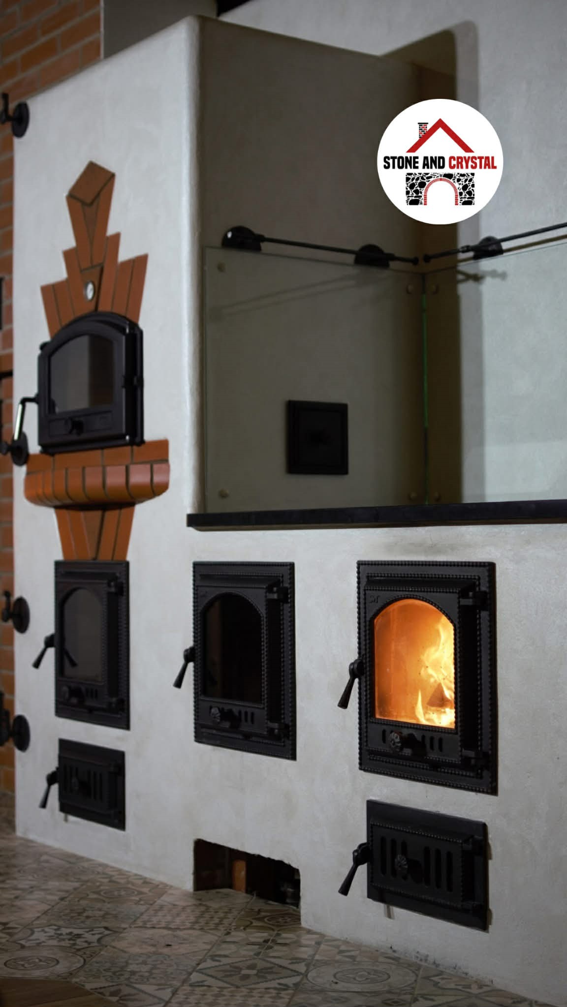 Tilsi-Tamme küttekompleks Pihlapuude väravalt viib looklev tee ilmapuu alla. Siin ilmapuu kaitsva võra varju alla on loonud veelinnurahvas oma koja ja just sellesse kotta viiski seekord meid meie tee. Aeg läheb uskumatult kiiresti ja nagu vahest ikka juhtub saame pildistama minna ikka tükk aega hiljem kui siseviimistlus on jõudnud järele. Nii ka seekord. Juba kolm aastat tagasi teostasime sellise küttekompleksi. Antud küttekompleks on lahendatud nii, et kogu kütmine toimub köögist ja kogu maja on soe. Tellija soov oli, et kui ta istub köögilaua taga oma kohal, näeb ka kõigis neljas koldes toimuvat ja kõigi kuue siibri asendit. Ja nii saigi tehtud! Küttekompleks koosneb suurest ahjust millel on poolkaares leso, eraldi leivaahjust ja pliidi kompleksist, koos soojamüüriga. Kõigest veidi lähemalt: Suure ahju tegime ikka mõnusalt suureks ja võimsaks maja südameks. Suur kolle mis lahendatud võlviga tagab ahjule pika salvestuskestvuse ja meeldiva toidutegemise võimaluse. Kliendi sõnul valmivad selle ahju koldes väga maitsvad söögid ja mis peamine, toit ei lähe kõrbema. Ahi on varustatud kahe siibriga. Ahju leso ja ahju ülemine osa on eraldi juhitavad ja kolde põlemisõhk tuleb koldesse ahju külgedelt.Selle ahju lesol kasutatakse pehmenduseks karunahka,põlislaane Vardja kasukat. Leivaahi: Leivaahju kamber on lahendatud puhta kambrina. Puhas kamber tähendab seda et sellest kambrist ei juhita läbi suitsu vaid suitsugaasid käivad über leivaahju kambri. Nii on leivaahju kamber puhas ja seda saab kasutada toidu tegemiseks kütmise ajal. Kliendi sõnul on leivaahi nende pere poolt pidevalt kasutuses ja selles pidid valmima väga maitsvad pirukad. Leivaahju kambrile paigaldasime ka termomeetri ja kambri lahendasime suure soojamahtuvusega šamott materjalist mis hoiab väga pikalt soojust ka siis kui koldes on tuli juba kustunud. Pliidi kompleks on lahendatud kahe koldena. Eraldi kolle vesipõranda küttele kuhu on paigaldatud pudel Sellisel viisil saab maja kütta ka elektrikatkestuse korral, sest juhul kui elekter on parasjagu ära saab kütta kõrvalolevat pliidi kollet ja pliidi kolle kütab soojaks soojamüüri. Pliidi plaat Nero Assoluto harjatud variant, paksus 30mm. Malmi asemel kasutasime keraamilise klaasi plaate mille lasime lõigata vastavalt soovitud mõõdule. Korstnapits: Korstnapitsi lähteülessanne stiili osas oli väga lihtne. Tee mul korstnapits mis küla teeks kadedaks just nõnda kõlas tellija soov. Ja selline ta siis lõpuks saigi. Lode Janka punane tellis ja tootja Meistri müürimört kombineerituna sellisesse stiili. Antud kompleksi teostamisel lõid käed külge A- Viimistluse OÜ, Anvar Valge. Kogu pinnaviimistlus kus kasutati mõnusa ja isikupärase efekti saamiseks lubi marmorino krohvi. Plaatimistööd teostas Plaat-Est OÜ, Anti Hüvenen Kulbivarnad meie koostööpartner sepp Kristjan Tuuleveski poolt