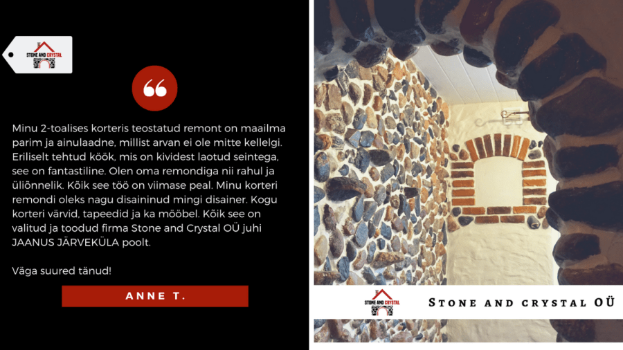 Minu 2-toalises korteris teostatud remont on maailma parim ja ainulaadne, millist arvan ei ole mitte kellelgi. Eriliselt tehtud köök, mis on kividest laotud seintega, see on fantastiline. Olen oma remondiga nii rahul ja üliõnnelik. Kõik see töö on viimase peal. Minu korteri remondi oleks nagu disaininud mingi disainer. Kogu korteri värvid, tapeedid ja ka mööbel. Kõik see on valitud ja toodud firma Stone and Crystal OÜ juhi JAANUS JÄRVEKÜLA poolt.