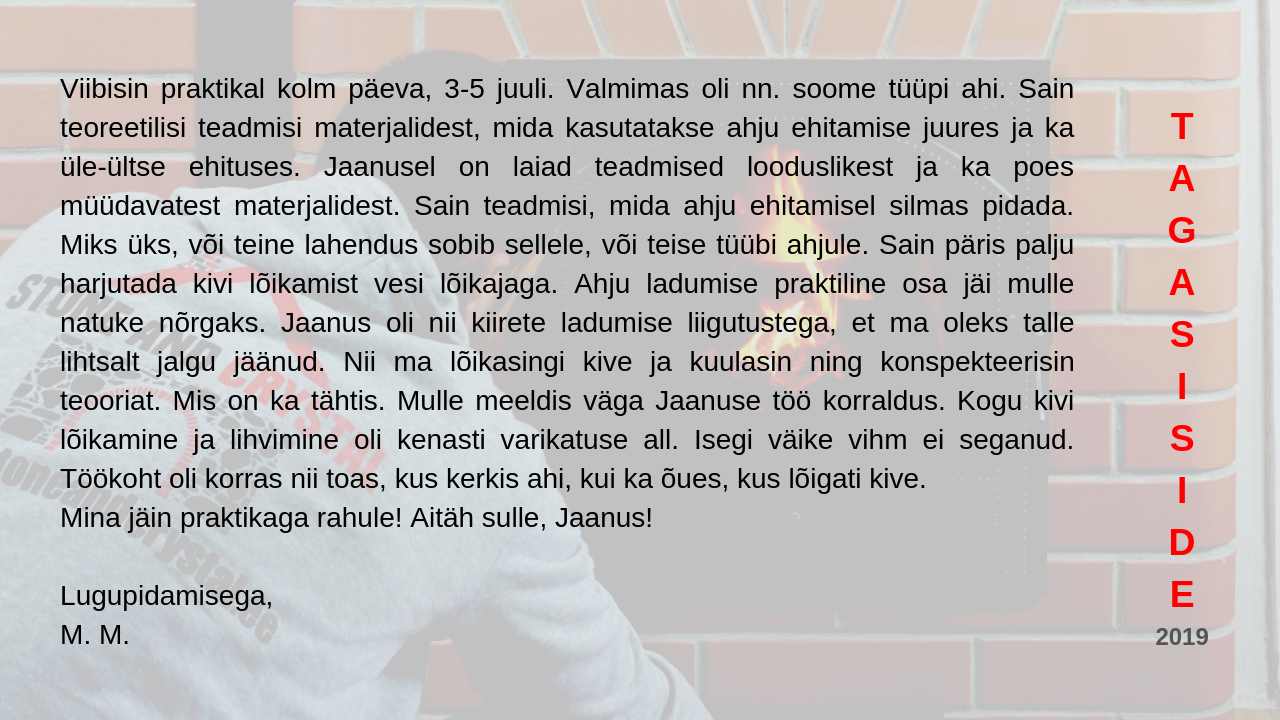 Viibisin praktikal kolm päeva, 3-5 juuli. Valmimas oli nn. soome tüüpi ahi. Sain teoreetilisi teadmisi materjalidest, mida kasutatakse ahju ehitamise juures ja ka üle-ültse ehituses. Jaanusel on laiad teadmised looduslikest ja ka poes müüdavatest materjalidest. Sain teadmisi, mida ahju ehitamisel silmas pidada. Miks üks, või teine lahendus sobib sellele, või teise tüübi ahjule. Sain päris palju harjutada kivi lõikamist vesi lõikajaga. Ahju ladumise praktiline osa jäi mulle natuke nõrgaks. Jaanus oli nii kiirete ladumise liigutustega, et ma oleks talle lihtsalt jalgu jäänud. Nii ma lõikasingi kive ja kuulasin ning konspekteerisin teooriat. Mis on ka tähtis. Mulle meeldis väga Jaanuse töö korraldus. Kogu kivi lõikamine ja lihvimine oli kenasti varikatuse all. Isegi väike vihm ei seganud. Töökoht oli korras nii toas, kus kerkis ahi, kui ka õues, kus lõigati kive.